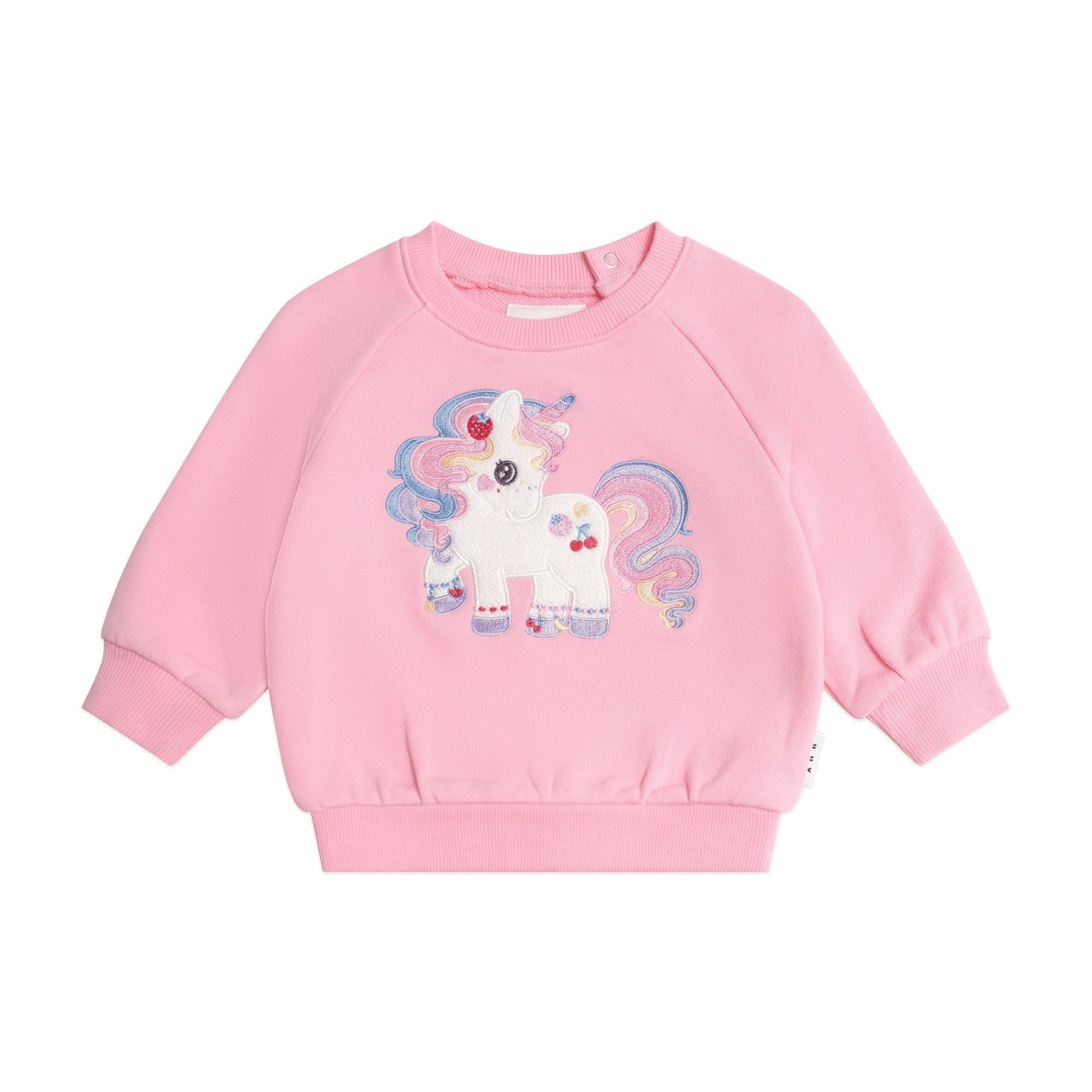 Proof unicorns do exist. At least at Huxbaby, and in little imaginations. This warm and cosy terry sweatshirt is made from fluffy organic cotton, it features a sparkly tutti frutti unicorn embroidery on the tummy and stainless steel back snaps in baby sizes. Match it with our Huxbaby Tutti Frutti Unicorn Track Pant for a co-ord look.