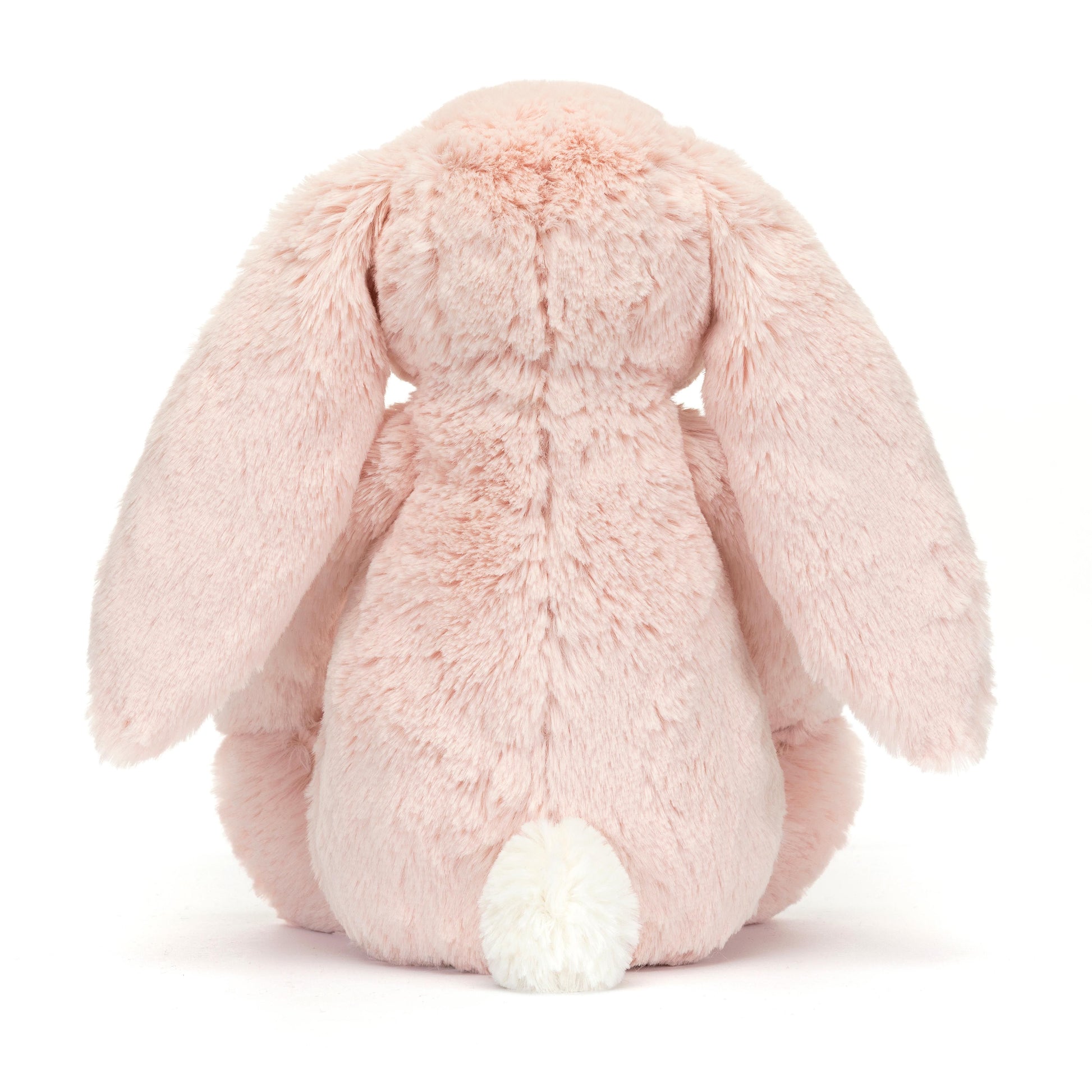 In iconic blush-pink Bashful fur with a cream bobtail, Blossom Blush Bunny has soft cotton floral ears and feet, printed with an original Jellycat design of pink flowers and green leaves.