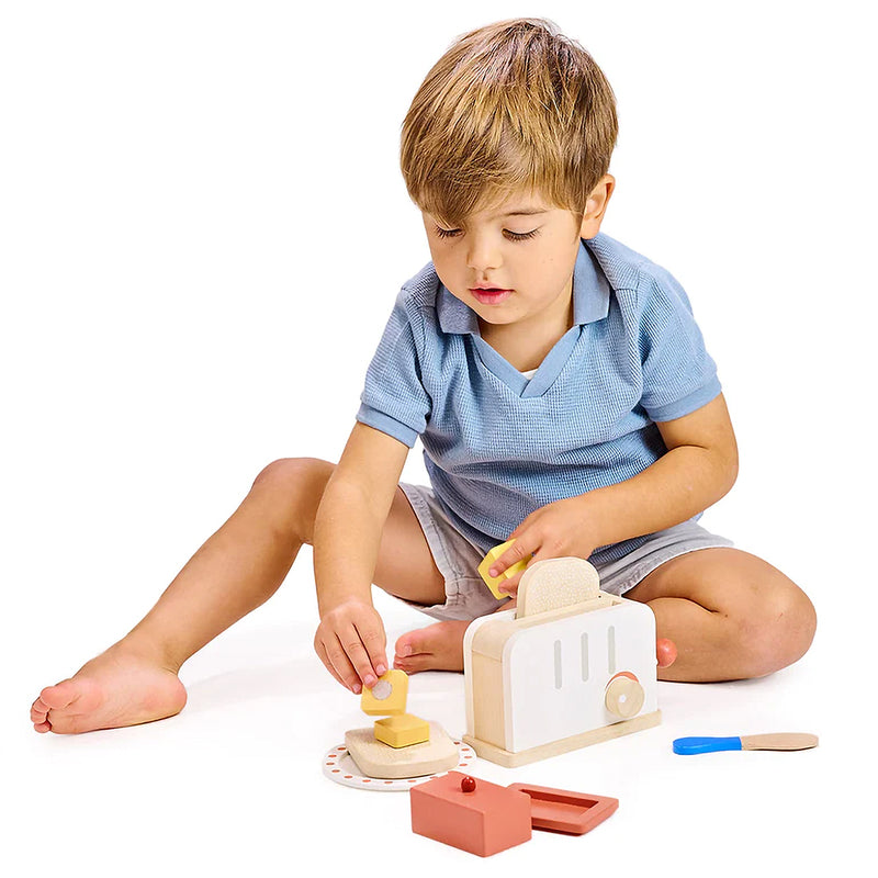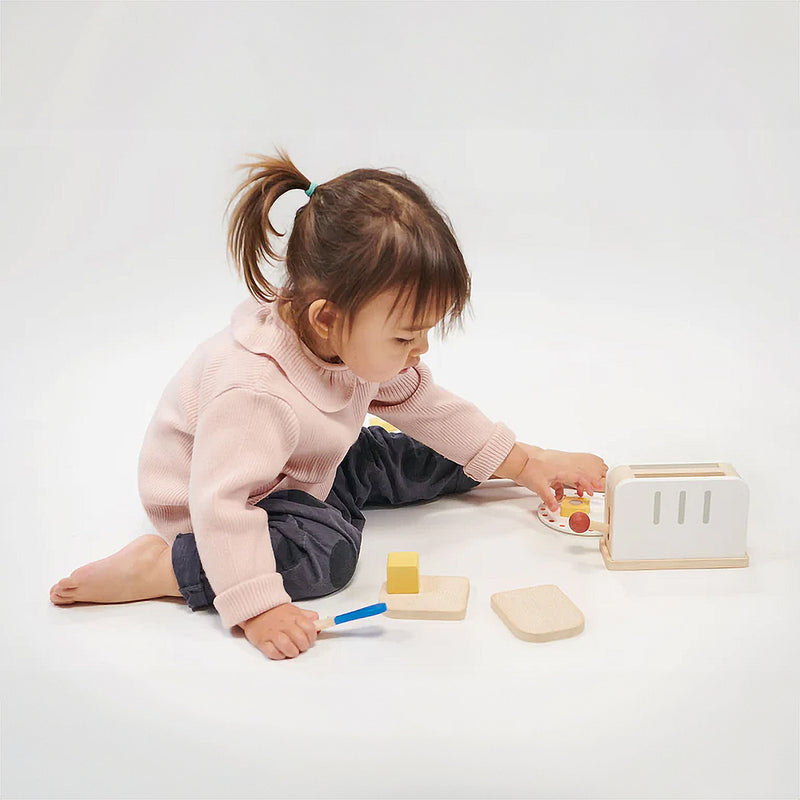 Get ready for a playful breakfast experience with this wooden toy toaster set! Enjoy the scrumptious world of imaginative toast-making with a two-slot toaster featuring a fun push-up mechanism. This fun set includes: