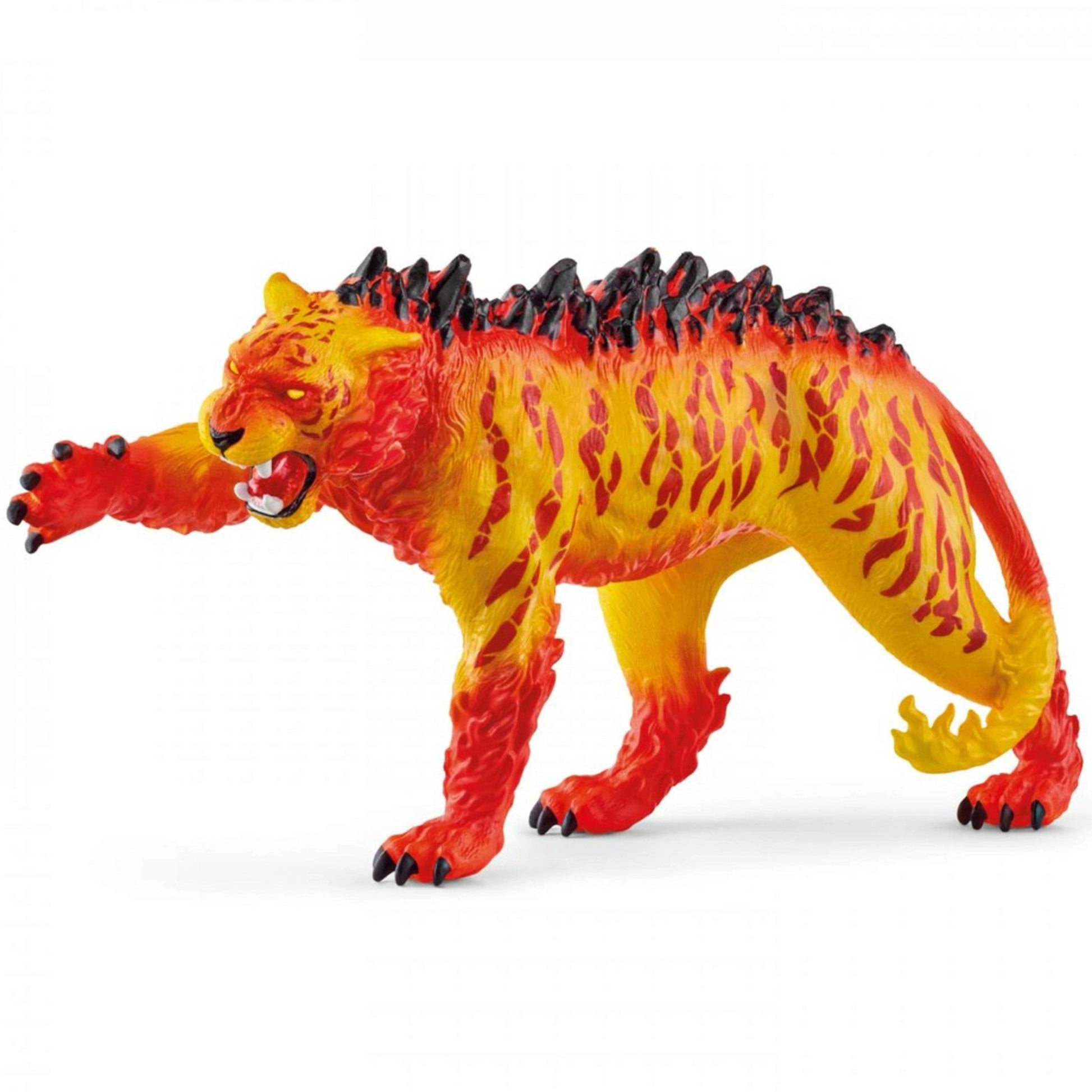 Schleichäó»s Lava Tiger is a wild Eldrador creature living in molten caves and crags of volcanic areas. This beastie is sculpted in a striking pose, with its from right paw extended in attack, while its other three fiery paws are on the ground. Its body is covered in yellow fur with red stripes and red colouring on its limbs, neck and top of its tail. Protruding along the ridge of its back are black rocky spines which match its sharp claws. Its face is snarled, highlighting its magical yellow eyes, and its vicious open mouth which is roaring and showing its sharp and ferocious teeth to its opponent, sure to scare them off.