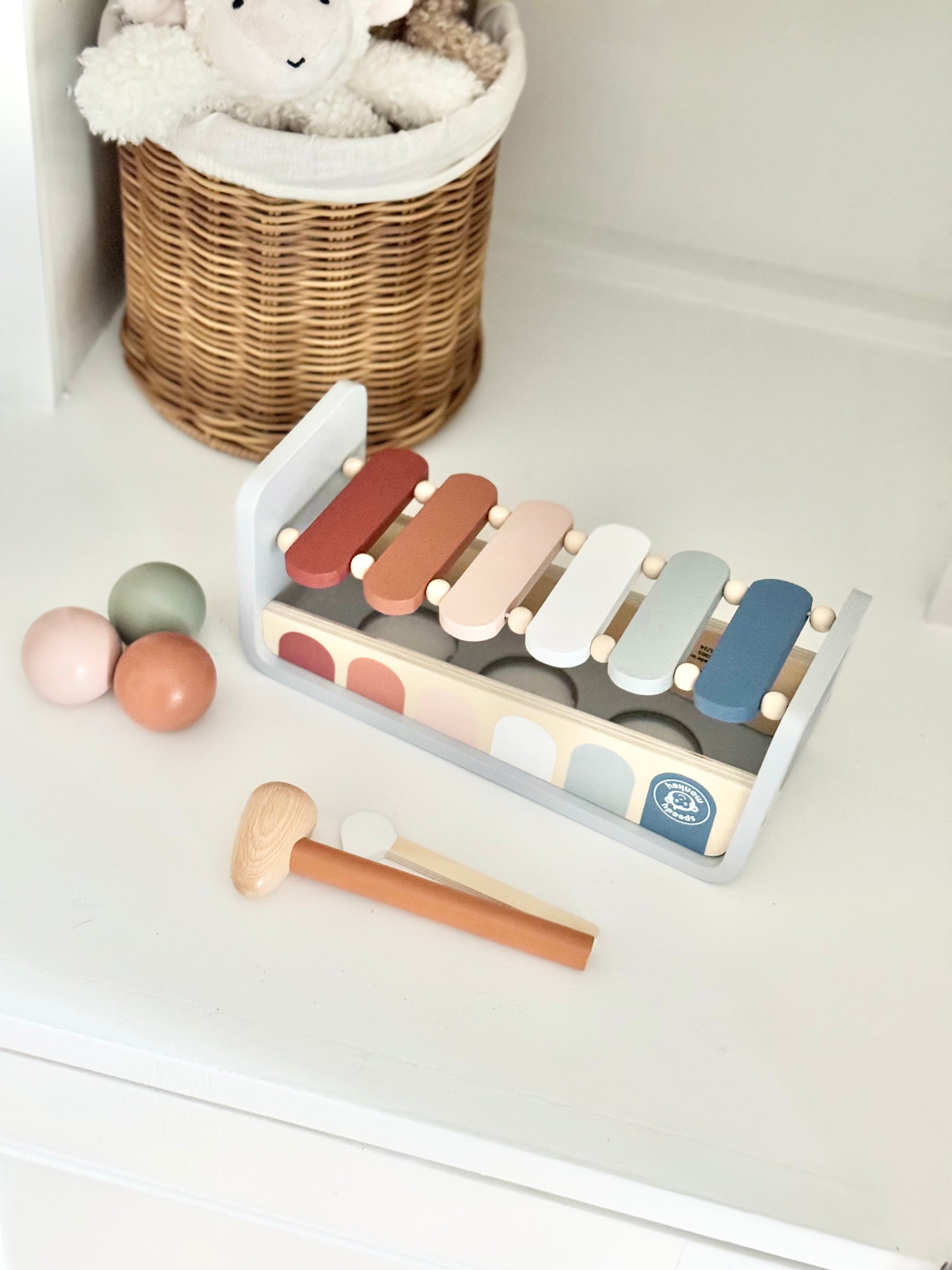 This all wooden Xylo "bench" is colourful, durable and safe with no rough or sharp edges. It includes three balls which your little one can hammer down into the slots and slide on the wooden xylophone under. This fun toy helps your toddler acquire and strengthen their logic, coordination, and cognitive abilities. This toy is crafted from sustainably sourced wood from FSC® certified forests and coated with non toxic paint.